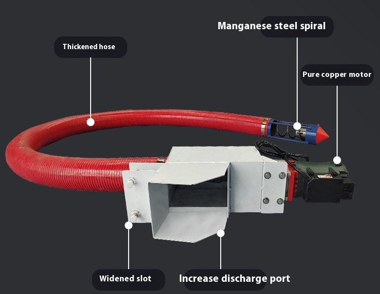When the operator turns the handle, the drive shaft drives the flexible spiral blade to rotate in the conveying pipe. The rotating motion of the spiral blade pushes the material from the feed port to the discharge port, realizing continuous material transportation. Due to the flexible characteristics of the spiral blade, the conveying pipe can be bent and arranged according to the actual working environment, and can easily cope with vertical lifting, horizontal conveying, or inclined conveying. During the conveying process, the material is pushed by the spiral blade and moves along the inner wall of the conveying pipe, so that it is stably conveyed to the designated position.