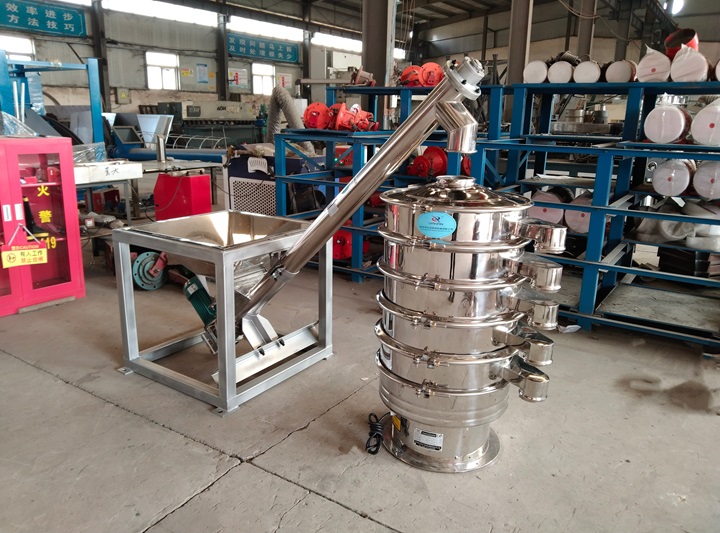 Vibrating Screen: Barium sulfate powder grading and screening. The screw conveyor transports raw materials to the inlet of a vibrating screen, which separates barium sulfate powder into different finenesses according to particle size requirements.