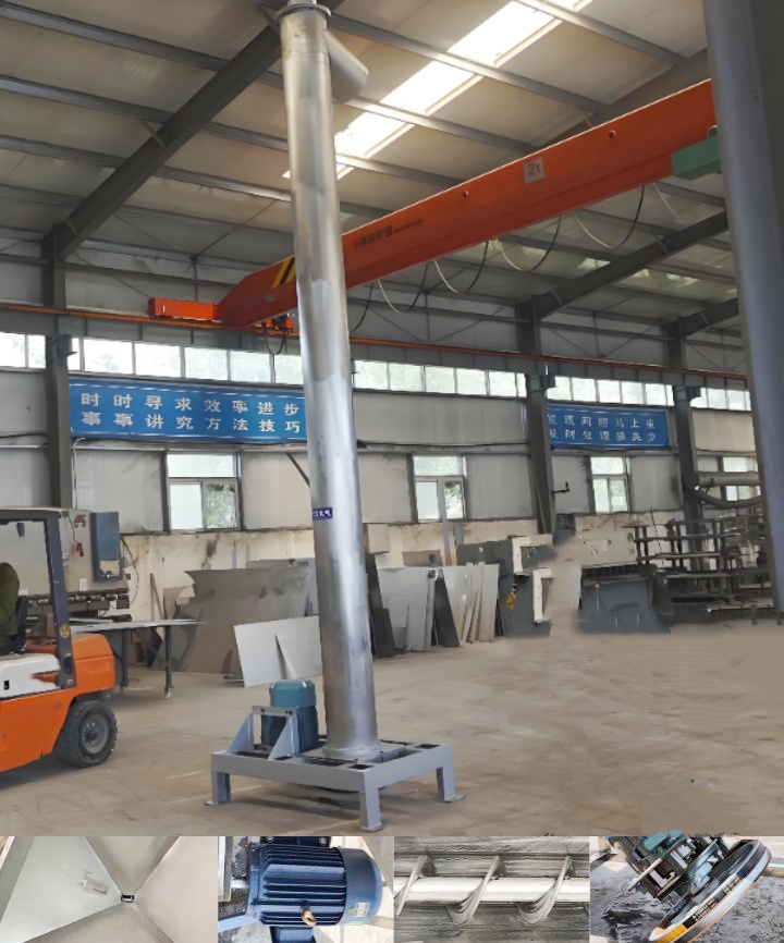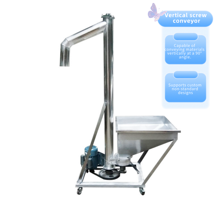 The Edible Salt Vertical Screw Conveyor mainly consists of a food-grade drive unit motor and reducer, a stainless steel spiral main shaft, a sealed conveying cylinder, a food-grade feed inlet, a discharge outlet, a vertical support frame, and sealing components. The drive unit provides stable power and low noise, adapting to the load requirements of vertical conveying; the spiral blades are made of thickened food-grade stainless steel, with controlled pitch to reduce salt particle crushing; the sealing components use food-grade seals to prevent leakage and dust ingress, ensuring the hygiene of the edible salt; the vertical frame structure is robust and can be customized according to the lifting height to adapt to different workshop layouts.