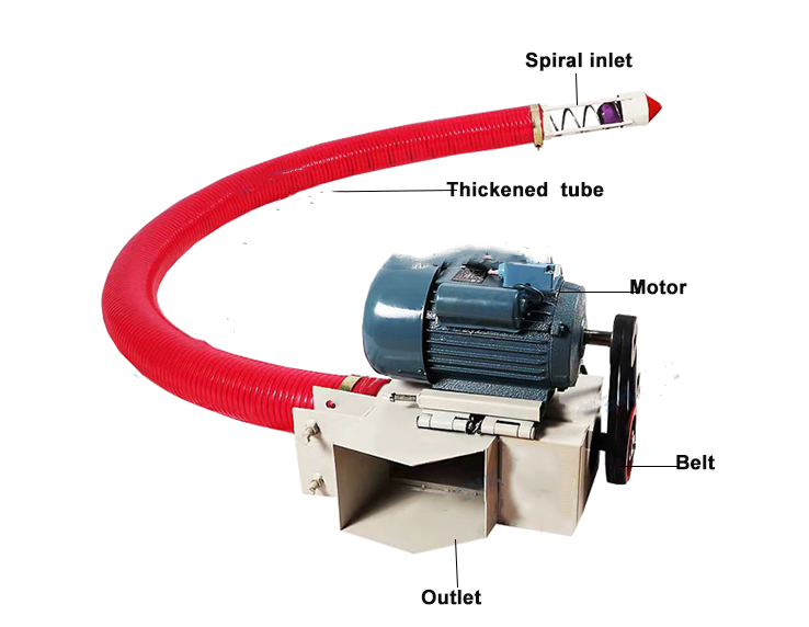 The Grain Pumping Portable Grain Suction Auger Screw Conveyor Small consists of four main parts: a power system, a conveying channel, a suction and discharge device, and a supporting moving structure. These components work together to achieve lightweight and efficient grain transfer.