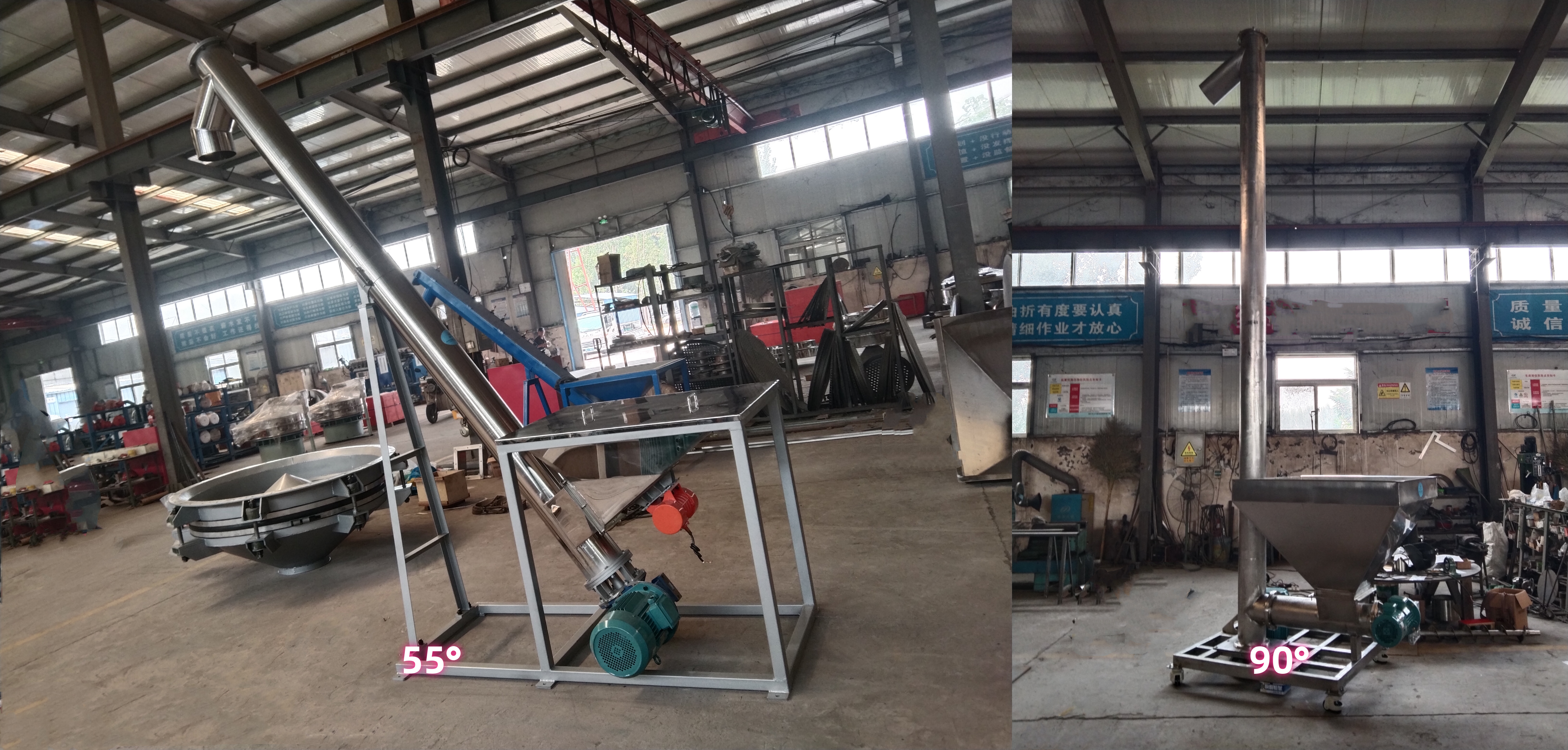 Our oat flour screw conveyors offer conveying angles of 0-90° and can be customized to meet customer production requirements. Generally, shaft-tube screw conveyors have a maximum inclination angle of approximately 45°, and vertical conveying is possible in special circumstances. Shaftless screw conveyors typically have a maximum inclination angle of approximately 30°. The inclination angle of a U-shaped screw conveyor is generally between 20° and 30°.