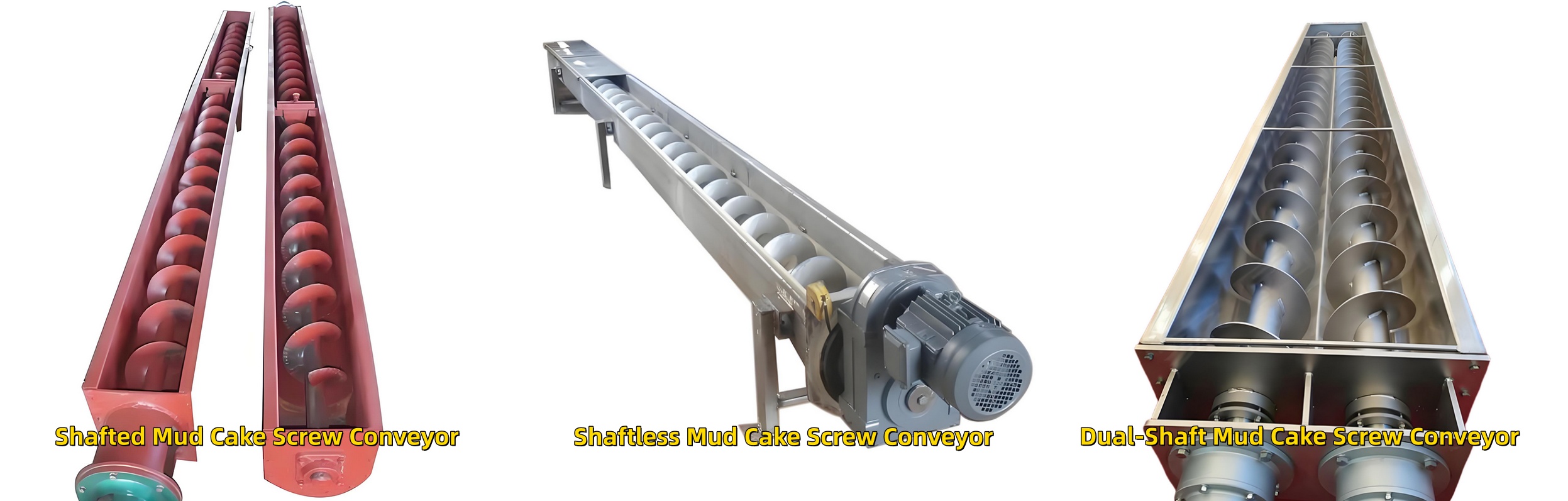 The Screw Conveyor for Mud Cake main body includes a non-stick coated U-shaped tank and shafted/shaftless/dual-shaft helical blades. The drive system includes a motor, reducer, and frequency converter, with precise coordination among components to adapt to different working conditions for sludge cake transfer.