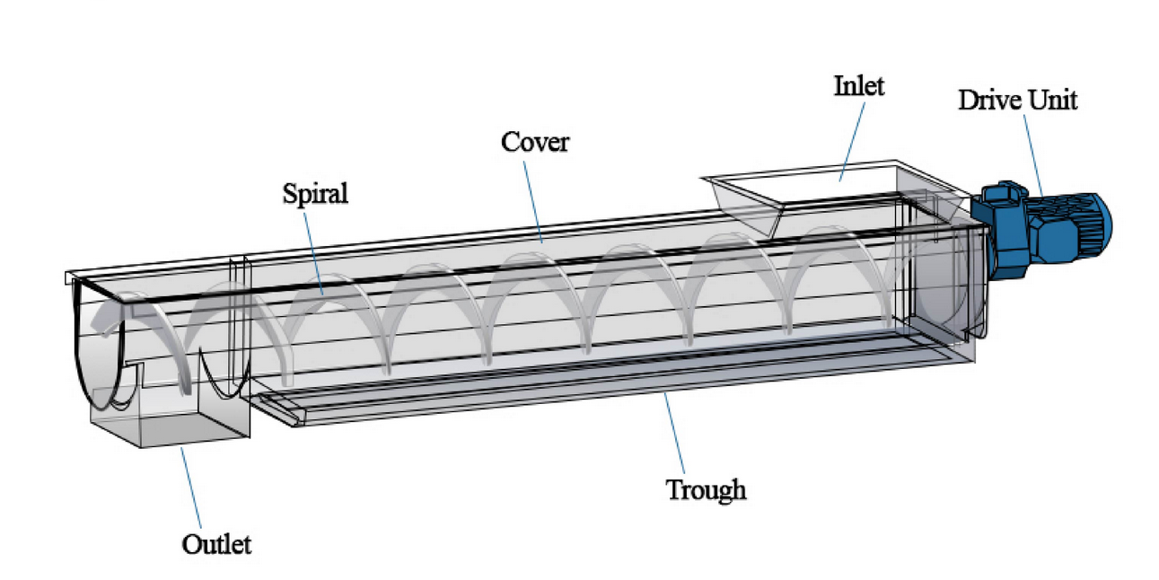 Conveying Body: Composed of the U-shaped tank, helical blades, and helical shaft, it is the core for material carrying and conveying.