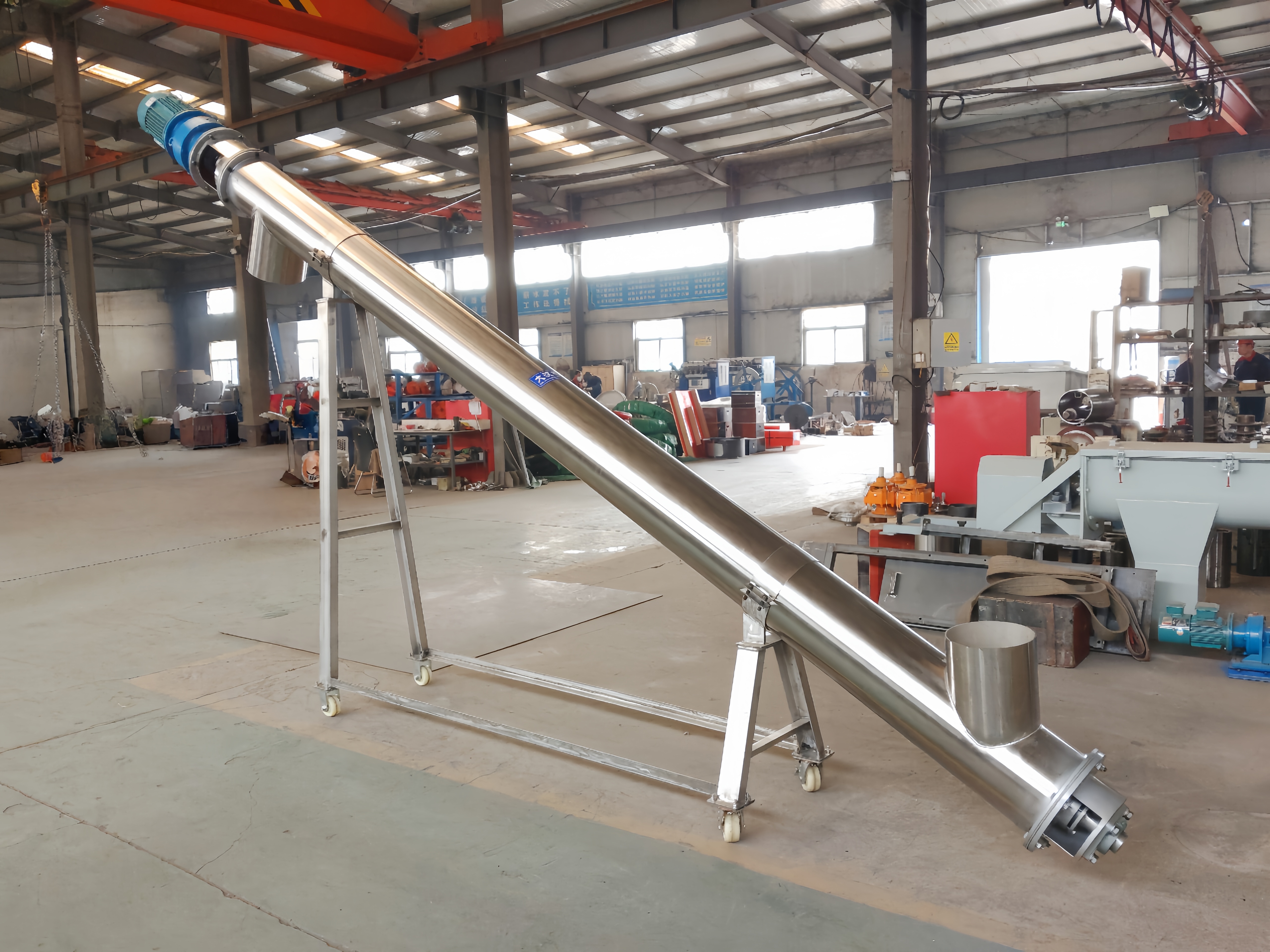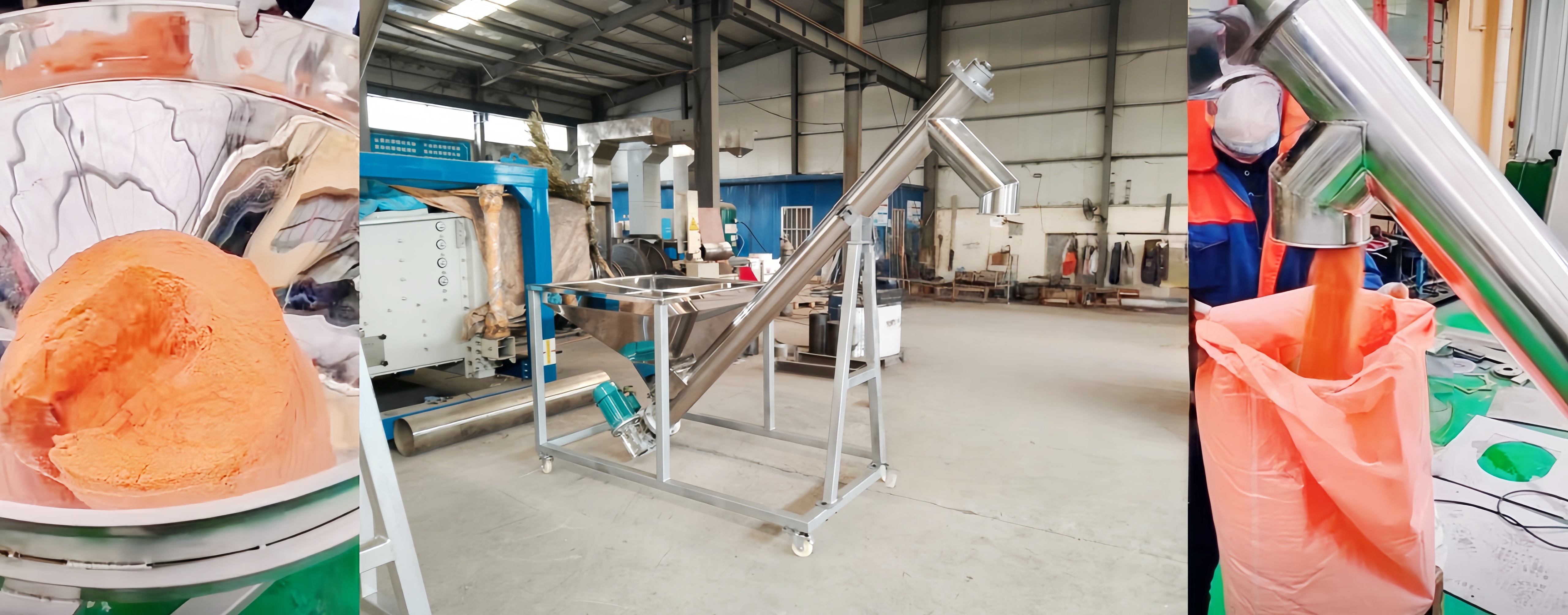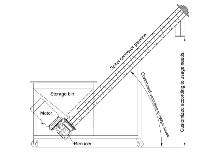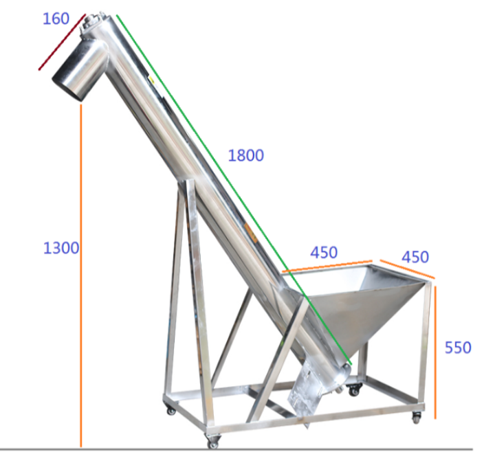 A large aquatic feed company previously relied on manual handling of shrimp shell powder, which was not only costly in terms of labor but also resulted in material spillage and dust pollution in the workshop. After introducing a customized stainless steel inclined screw conveyor, they achieved continuous automated transport of shrimp shell powder from the crushing workshop to the feed mixing silo, requiring no manual intervention throughout the process. The equipment features custom-designed casters at the bottom, allowing for easy repositioning and transport of shrimp shell powder to different workstations. The conveyor is 5 meters long, at a 30-degree angle, with a pipe diameter of 125mm, and can process up to 600 kg per hour. The customer reported that the equipment is highly practical, significantly simplifying the production process and reducing labor intensity. They subsequently repurchased multiple units to adapt to new production lines.